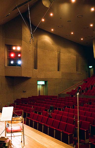 このホールは多目的用で響の少ないホールなので客席後方から約5mくらいの位置に