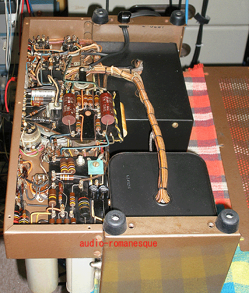 内部を開けてみた処、出力管6CA7のバイアス回路の電解コンデンサーが劣化していました。
