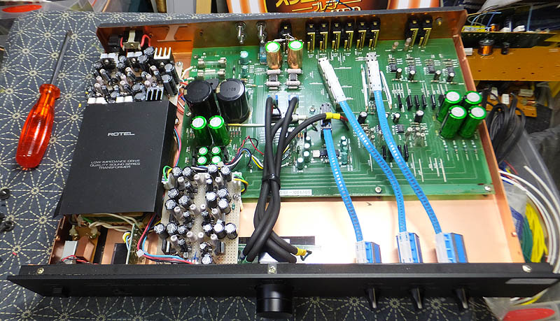 Rotel RC880MKVのチューン 19/10/09 古いローテルのプリアンプです。 内部は電源回路から左右別電源になっているので、 セパレーションの良い音です。 電源トランスはRコアです。 フラットアンプは新たに設計をして回路を変えています。 定電圧電源を新たに製作して交換しています。 フォノイコライザーはMCとMMが別回路になっています。 切り替えスイッチが小さいのでやり難いですが、 合理的な設計です。