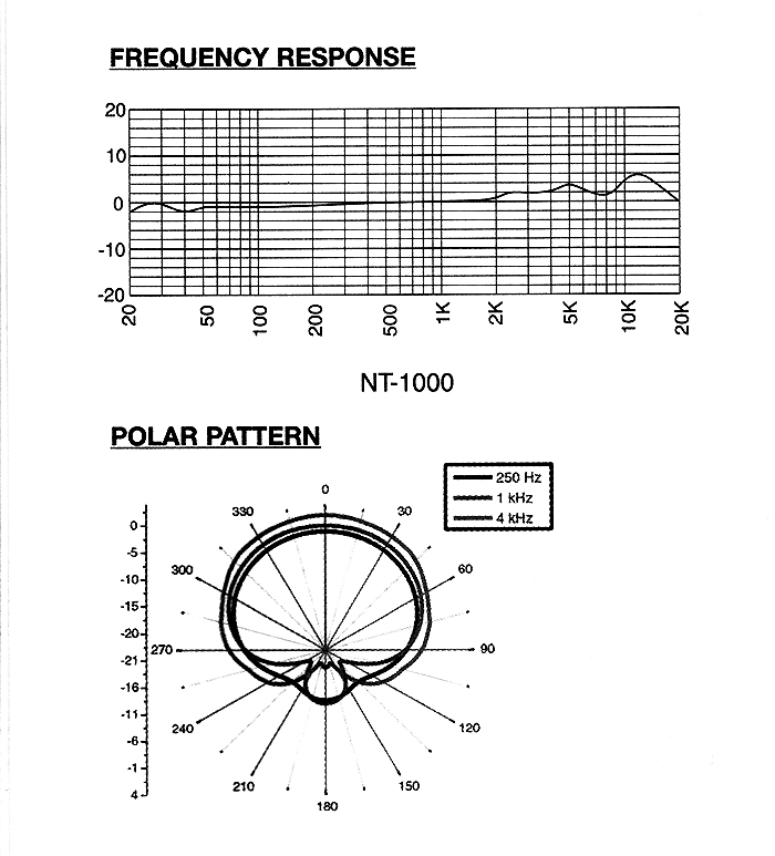 Rode NT1000 コンデンサーマイクロフォン Rodeの単一指向性のコンデンサーマイクロフォンです。 結構外形の大きいマイクロフォンです。 ノイマンのU87とほぼ同等の大きさです。 単一指向性のデータです。 (取り扱い説明書より) 出力トランスレス設計でファンタム電源(DC48V)仕様です。 S/Nは良いのですが、ちょっと高域がシャリシャリします。 位相特性が良いので音源の位置が良く判ります。